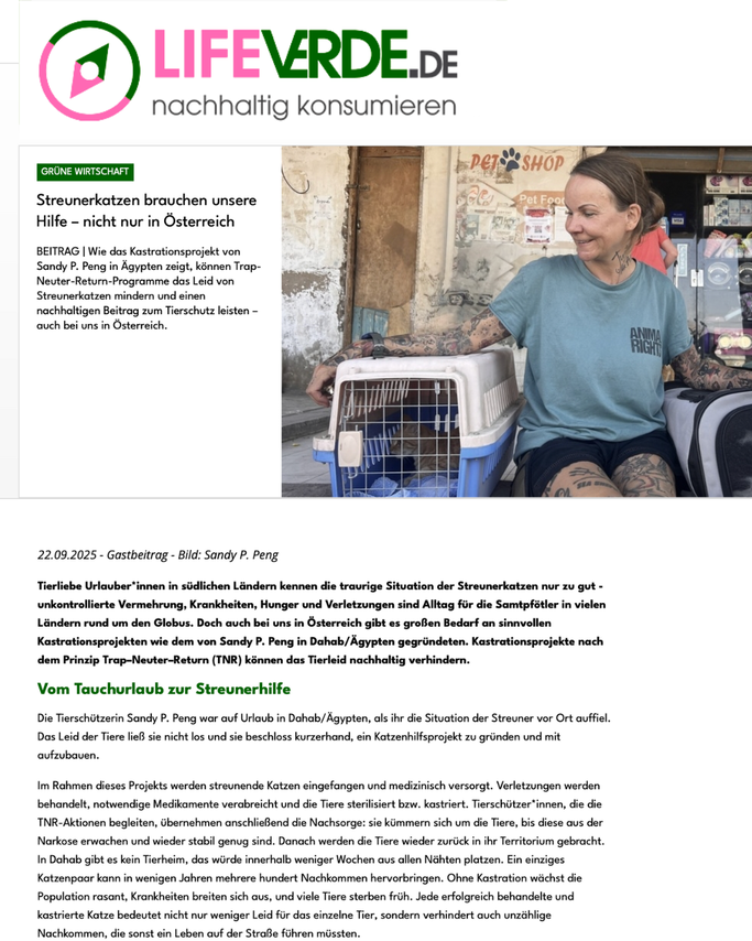 26. September 2025 Artikel zum TNR-Projekt auf lifeverde.de "Wie das Kastrationsprojekt von Sandy P. Peng in Ägypten zeigt, können Trap-Neuter-Return-Programme das Leid von Streunerkatzen mindern und einen nachhaltigen Beitrag zum Tierschutz leisten – auch bei uns in Österreich." - lifeverde.de Zum Artikel tagPlaceholderTags: